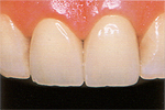 前歯の表面をごく薄く削り取り、表面だけ歯の形にしたものをはりつけます。削る量が少なく、変色歯などに最適です。 |